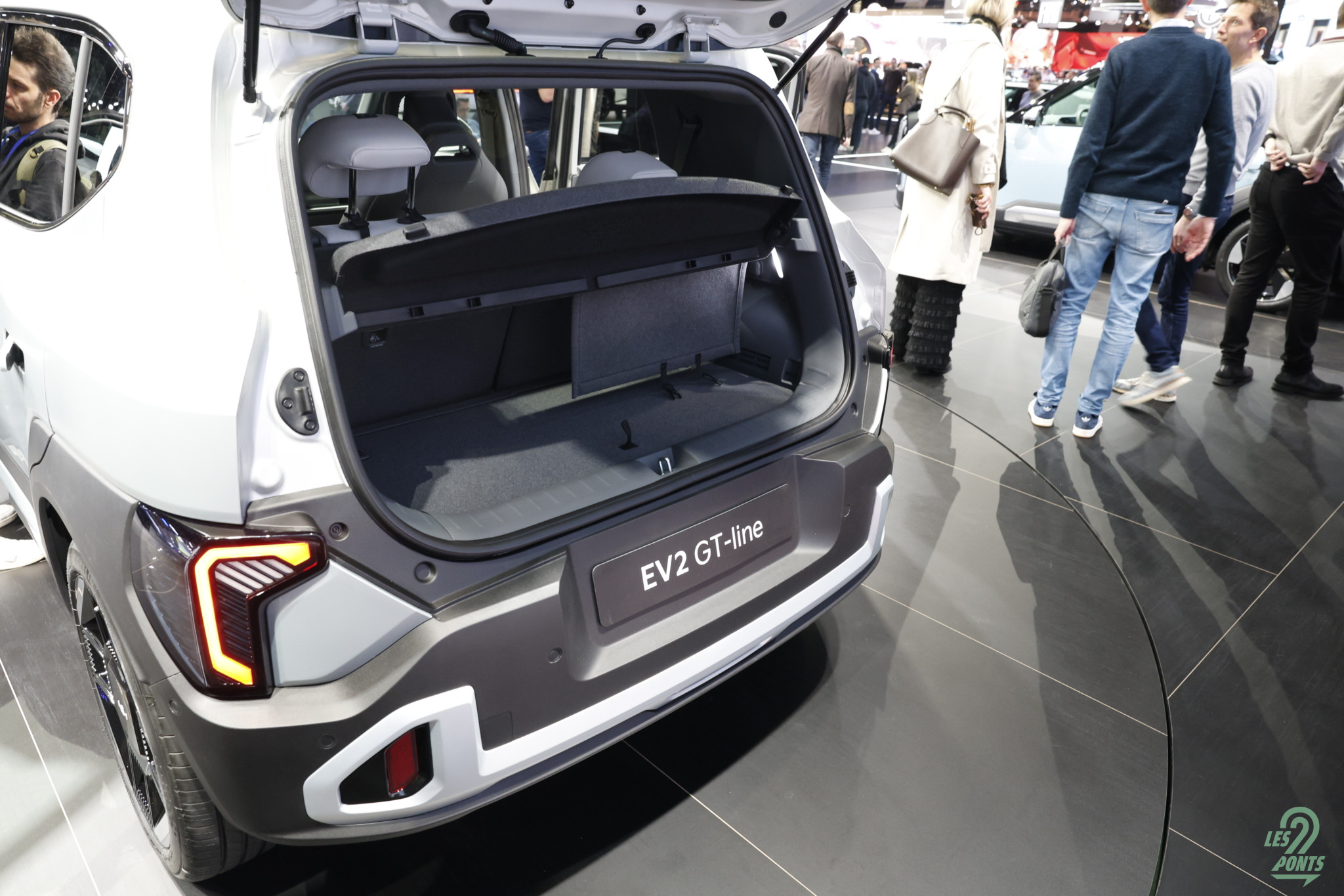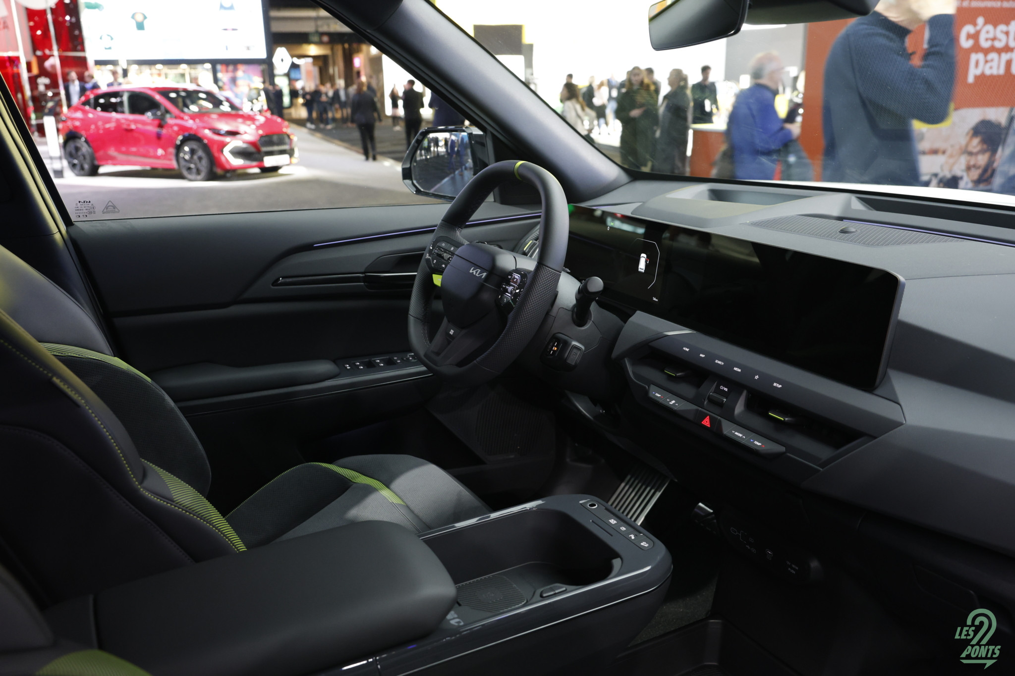 La planche de bord, fidèle aux nouveaux standards de la marque, impressionne par sa grande dalle numérique qui semble d’un seul tenant, regroupant un combiné de 12,3 pouces, une interface de climatisation de 5,3 pouces et un écran central tactile de 12,3 pouces. Même les modèles d’entrée de gamme profitent de cet affichage imposant, bien que le logiciel y soit simplifié. Côté services, l’EV2 se vit comme un smartphone grâce aux mises à jour à distance (OTA) et aux « Kia Upgrades », qui permettent d’ajouter des options technologiques à la demande, même après l’achat.