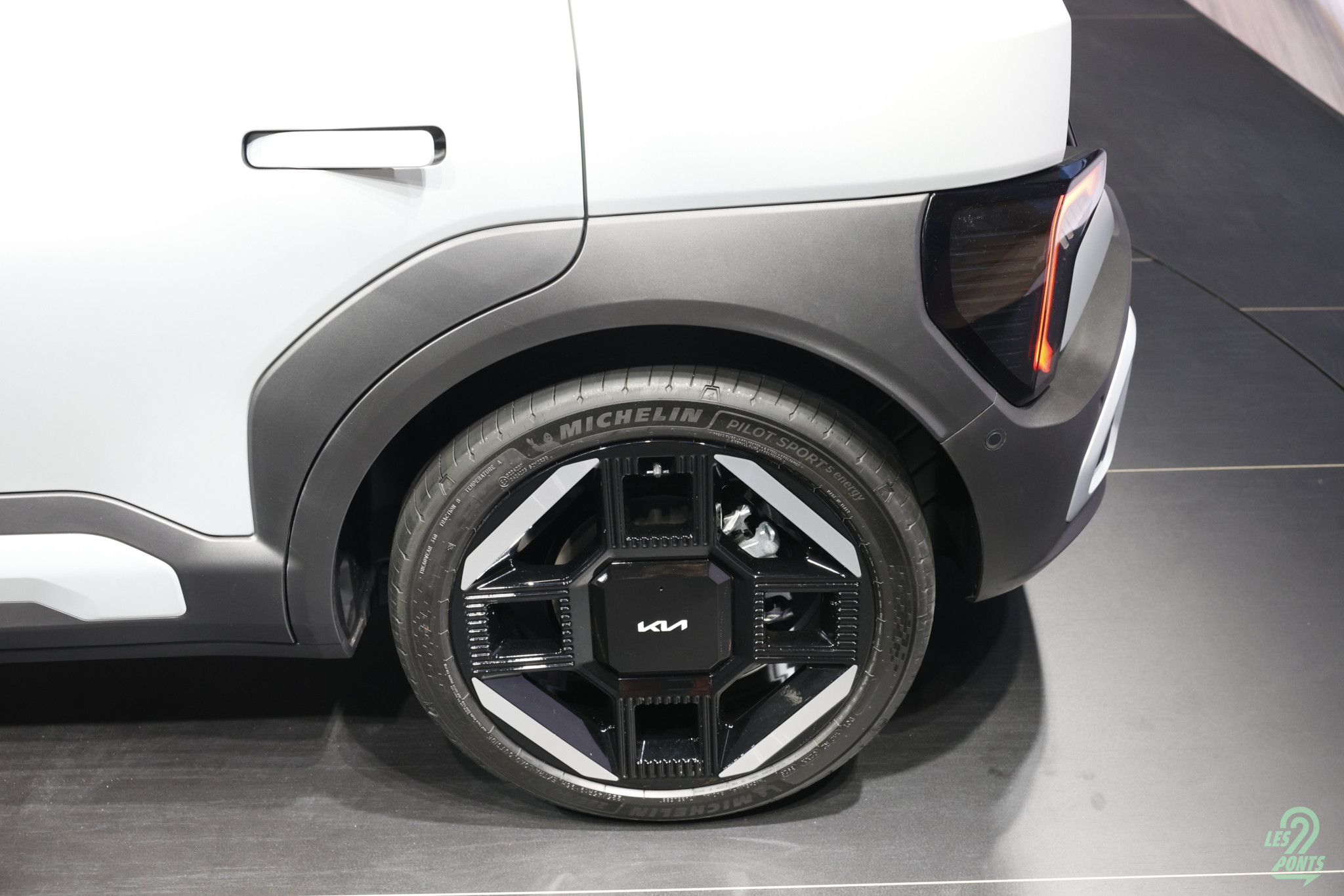 Ce SUV sud-coréen adopte un look pour le moins original avec des lignes très verticales et horizontales, mais ce qui choque, c’est surtout cet effet « EV9 miniature ». Les feux de jour verticaux, la nouvelle signature lumineuse « Star Map » et les passages de roues en plastique musclent ce petit SUV. Globalement, je suis plutôt conquis par cette identité propre à la gamme EV chez Kia, mais ici, la face arrière me laisse dubitatif : trop fade, presque triste, la faute aux feux arrière positionnés en position basse, laissant un vide pesant.
