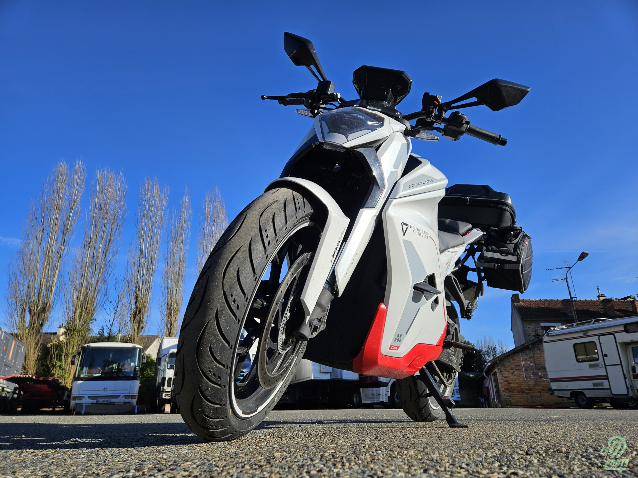 Lorsqu’Ultraviolette se décide enfin à arriver en France, au printemps 2025, une version Superstreet à la position de conduite redressée (80°) s’ajoute à l’offre globale. Mis à part un guidon plus haut et un choix de coloris légèrement différent, il s’agit là de la seule différence entre les deux finitions. Ayant fait le choix d’essayer les motos lors de tests d’usage quotidien, nous avons pris le guidon de la F77 Superstreet pendant une bonne semaine. La température a rarement dépassé les 10°, le soleil ne s’est montré qu’à de rares occasions – permettant quelques photos imprévues – ; la pluie nous a permis de mieux cerner le comportement routier de l’Ultraviolette et celui de sa batterie électrique de 10,3 kWh.