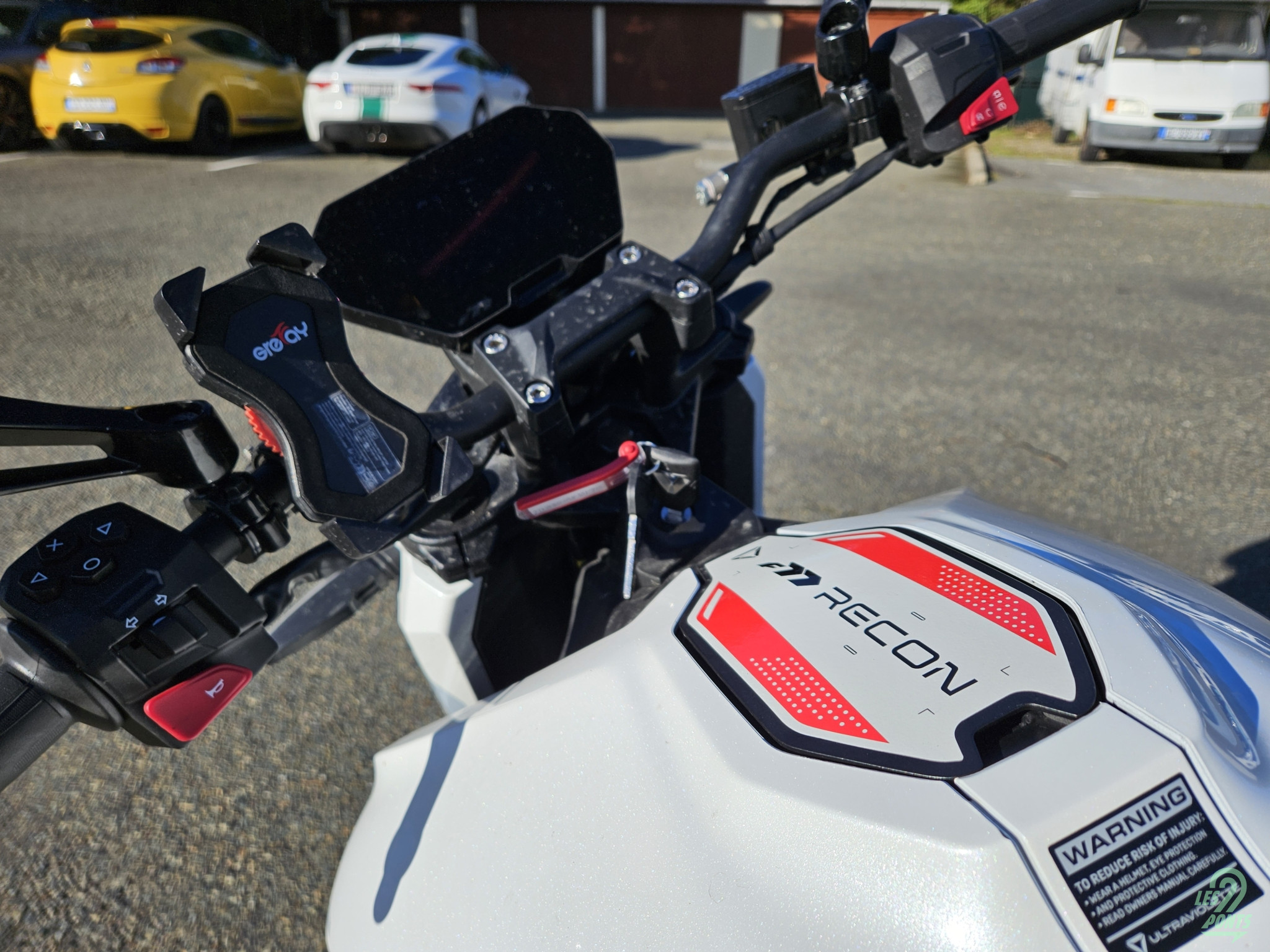 Dans une teinte Stellar White – encore un nom qui ne doit rien au hasard –, notre moto électrique dévoile ses courbes travaillées en toute agressivité. Pink Mobility, le distributeur exclusif, nous indique que le Cosmic Black est la couleur la plus populaire depuis l’arrivée de la F77 en France. C’est dommage, car il a tendance à lisser les formes. La bécane dispose d’un écran TFT de 5 pouces plutôt bien intégré dans la Superstreet – il est moins haut sur la Mach 2 –, dévoilant la connectivité de la moto : température de la batterie, surveillance de la pression des pneus, carte SIM LTE intégrée et Bluetooth 5.0 pour suivre son état depuis une application dédiée. Il est même possible de plonger la batterie dans une veille prolongée, en cas de départ en vacances ou d’hivernage.