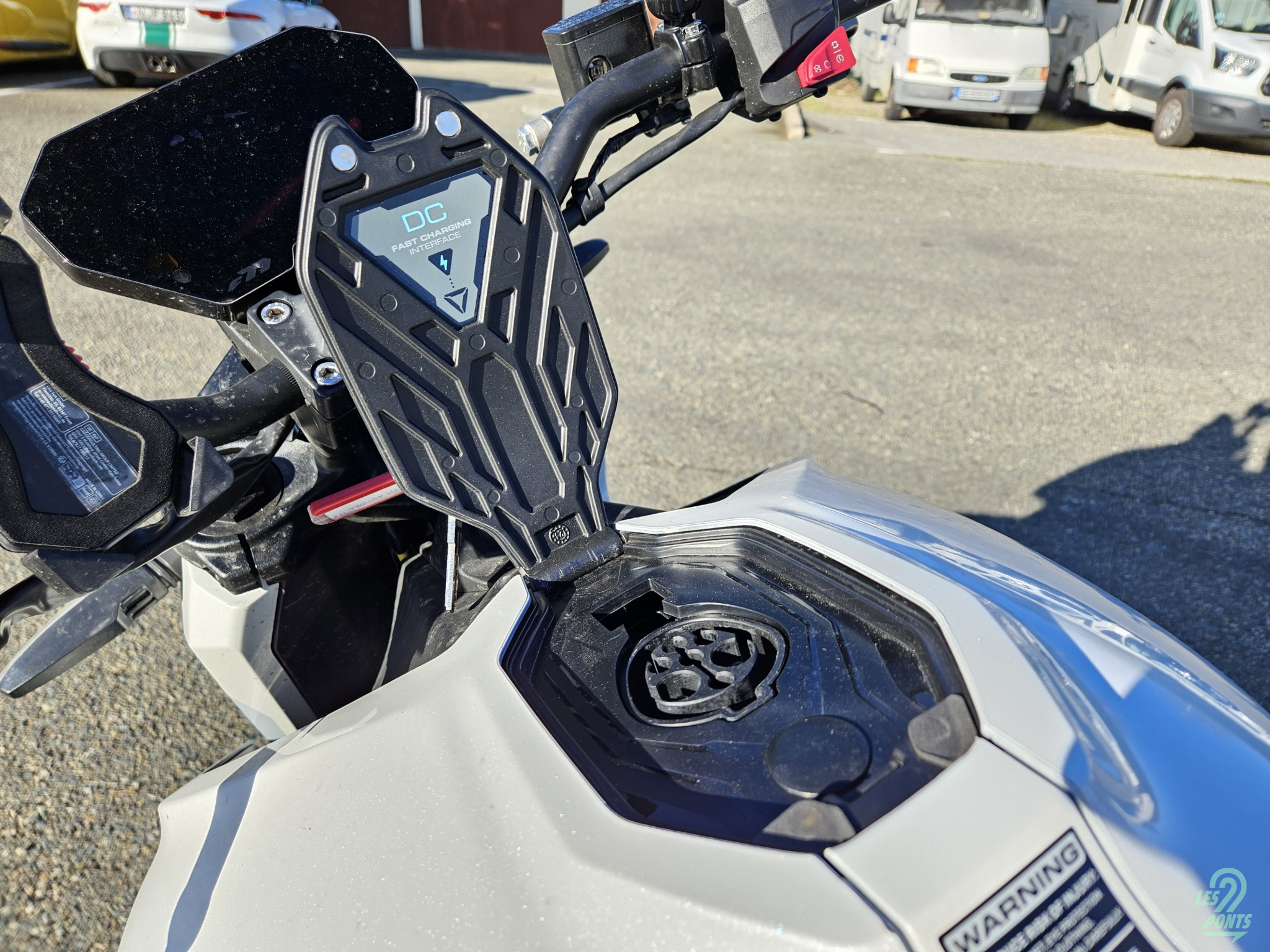 Avec la poignée tirée au maximum pendant plusieurs minutes, la F77 annonce une consommation de 150 Wh/km. Cet autre trajet particulièrement éprouvant, marqué par beaucoup de voies rapides dont des côtes de plusieurs centaines de mètres pour une distance totale de 44,8 kilomètres, laissera 27 % de batterie à la moto. 9 % perdus pendant la nuit froide en extérieur, le reste en roulant. Quand vient le moment de recharger, le conducteur sera surpris de voir qu’Ultraviolette a décidé de s’exporter avec du… Type 6. Vous ne connaissez pas ? Rien d’anormal, il s’agit d’une connectique utilisée quasi exclusivement en Inde. Il convient donc de se déplacer avec l’encombrant chargeur dédié – de 7,5 kilos, d’où l’importance du top case. Heureusement, celui-ci se branche sur prise domestique 220v. Attention néanmoins à certaines bornes de parking collectif. Celle de notre bureau refuse tout bonnement la charge, préférant se mettre en sécurité qu’affronter une sortie en T6