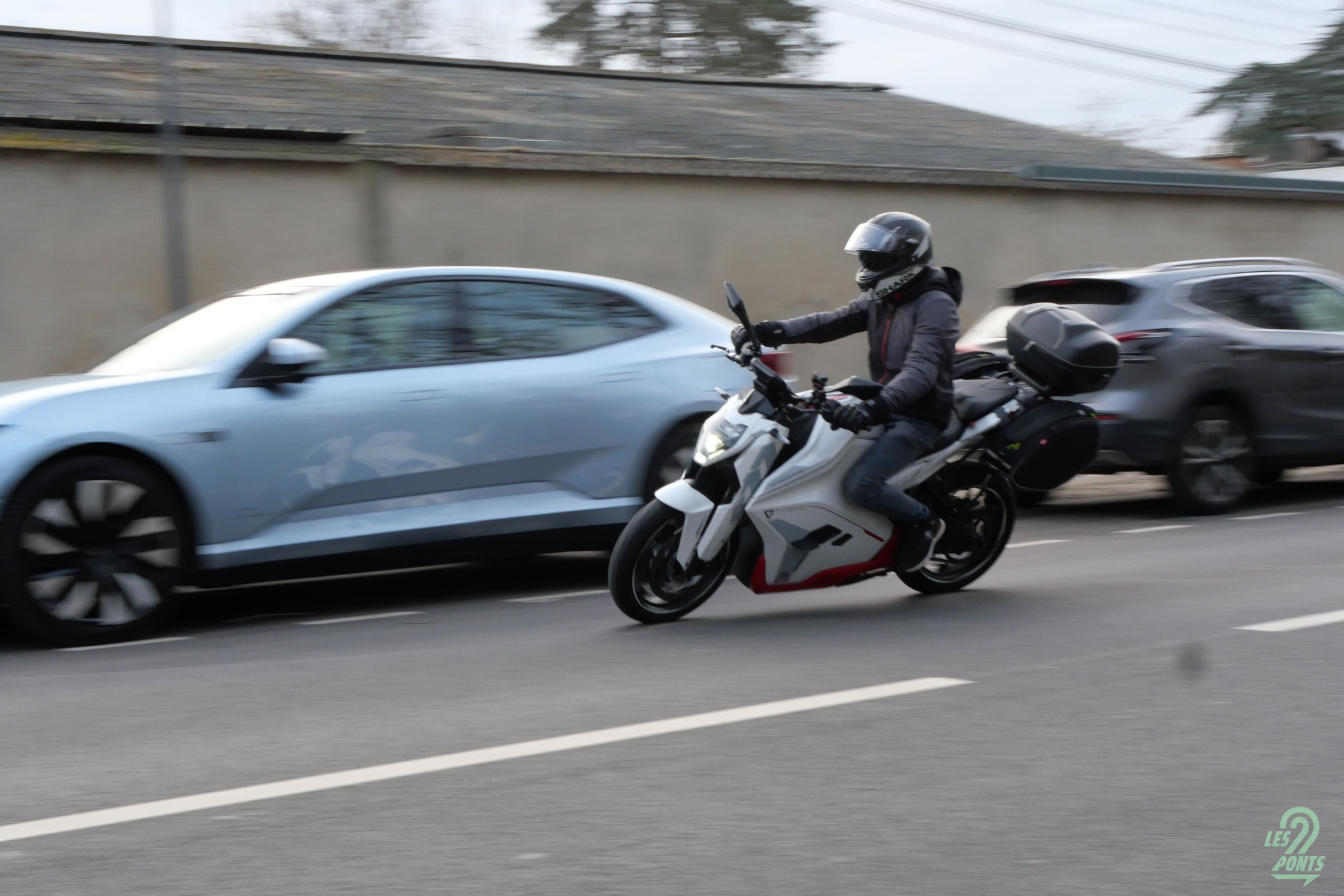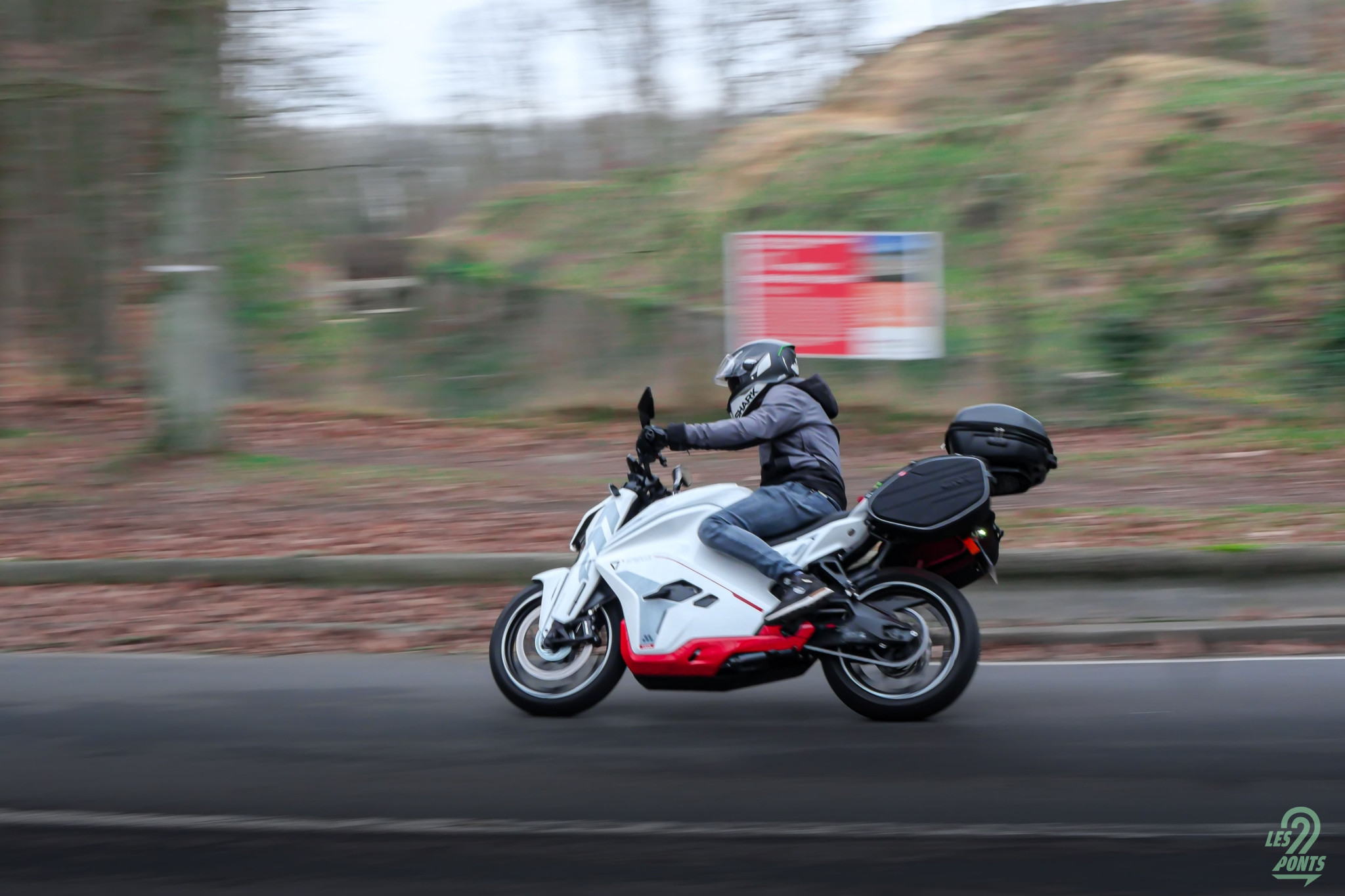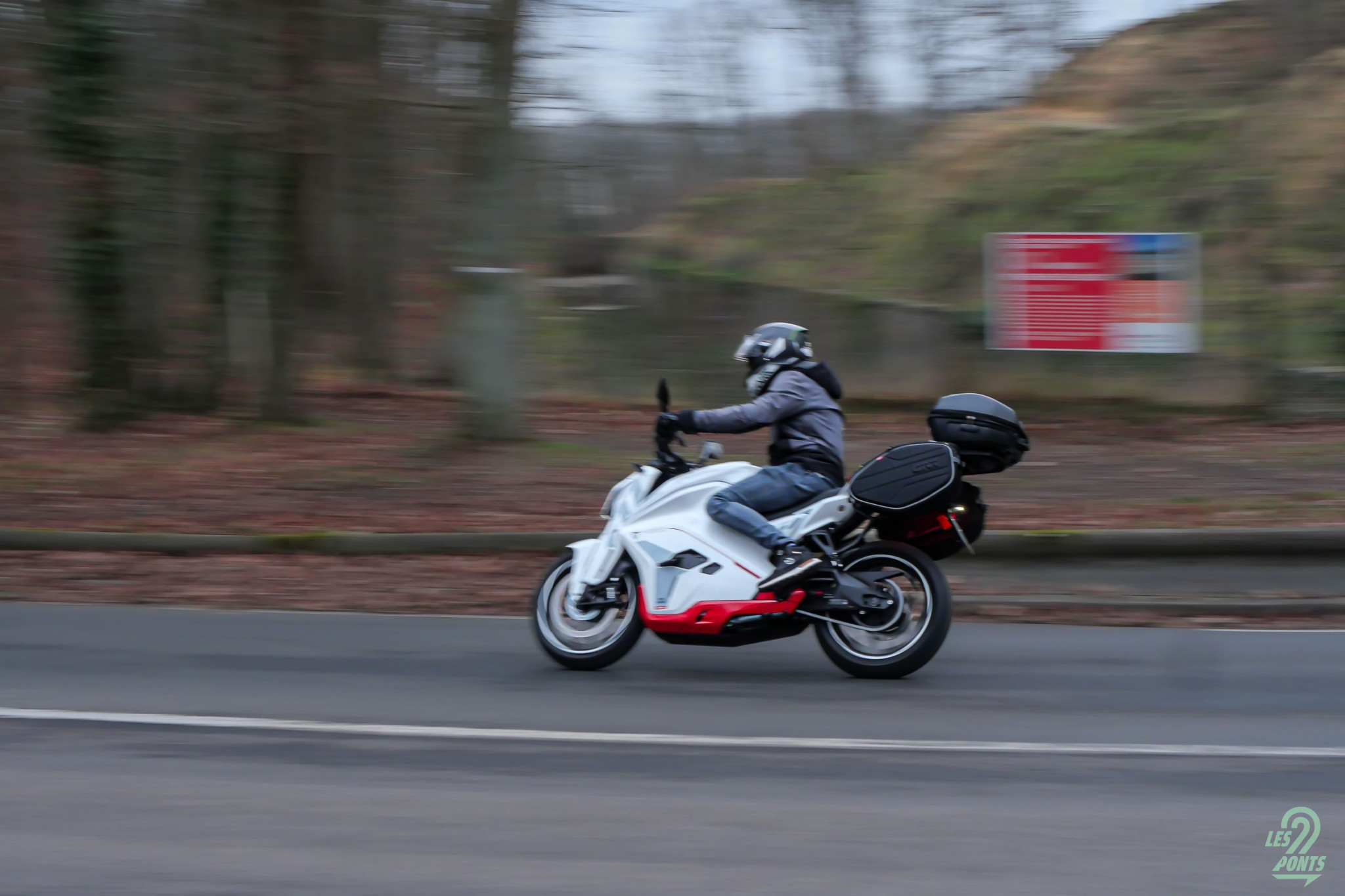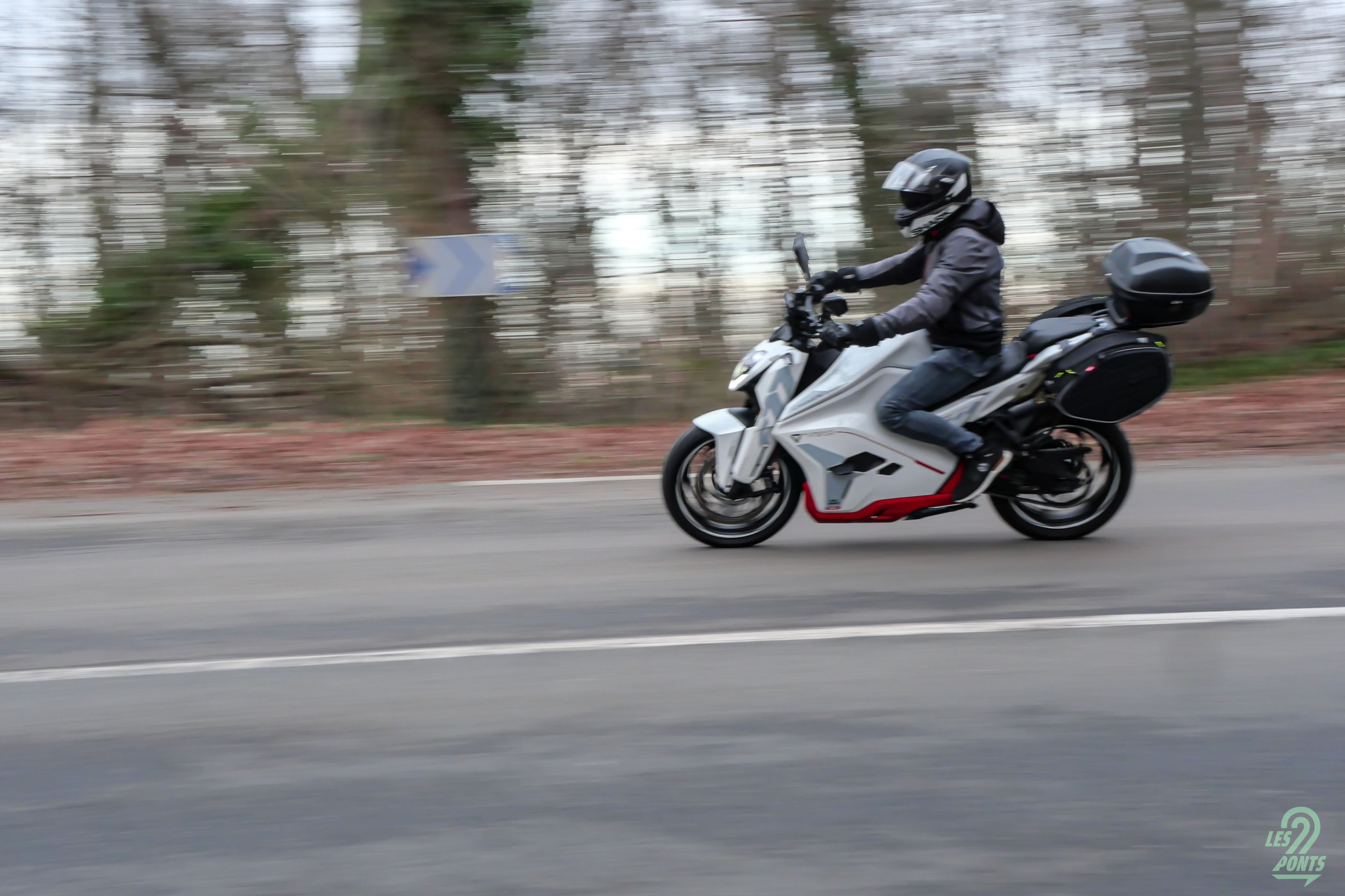 Passées 60 km/h, les reprises de la F77 sont étonnamment ‘molles’ pour une moto électrique. Il n’y a donc pas de coupure brusque lorsqu’elle arrive à sa V-Max. Il faudra, avant cela, réussir à l’atteindre. © Anthony Mota (@auto_mota)