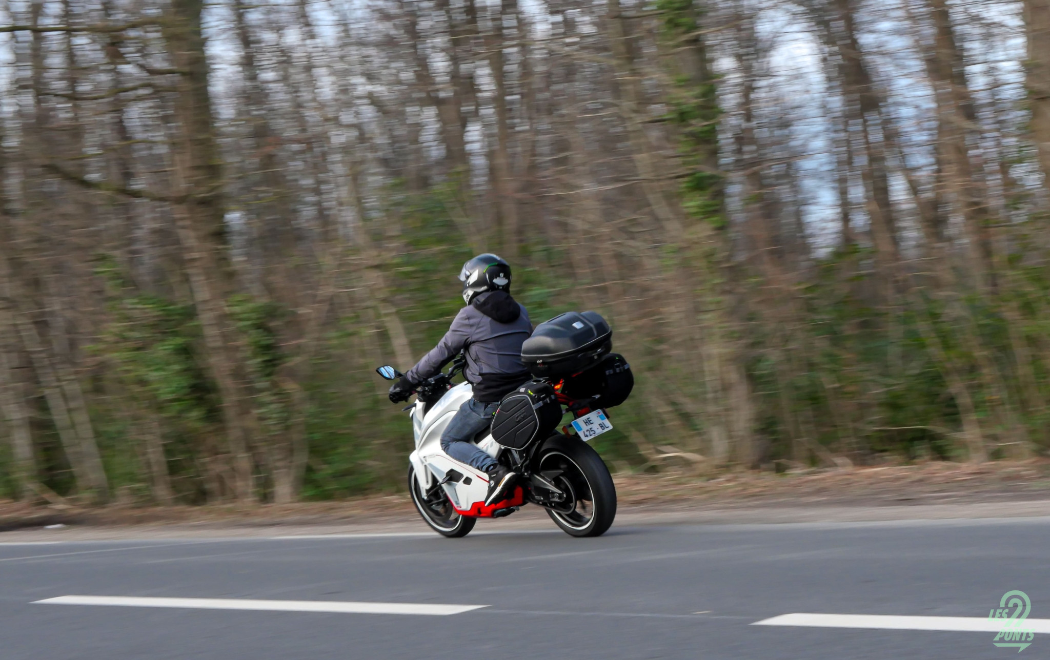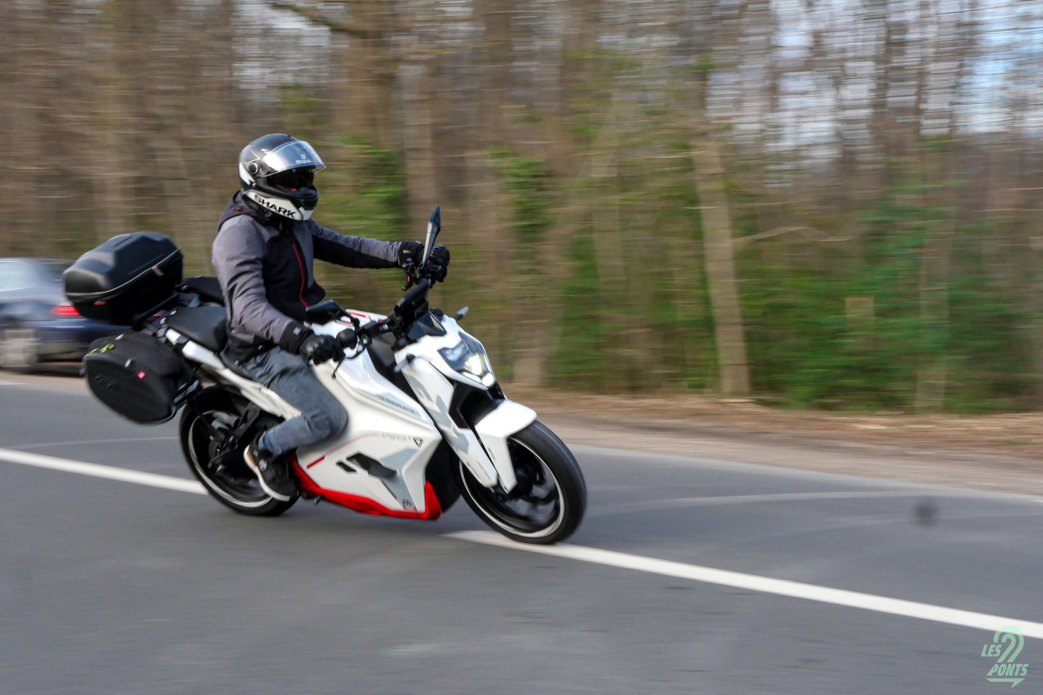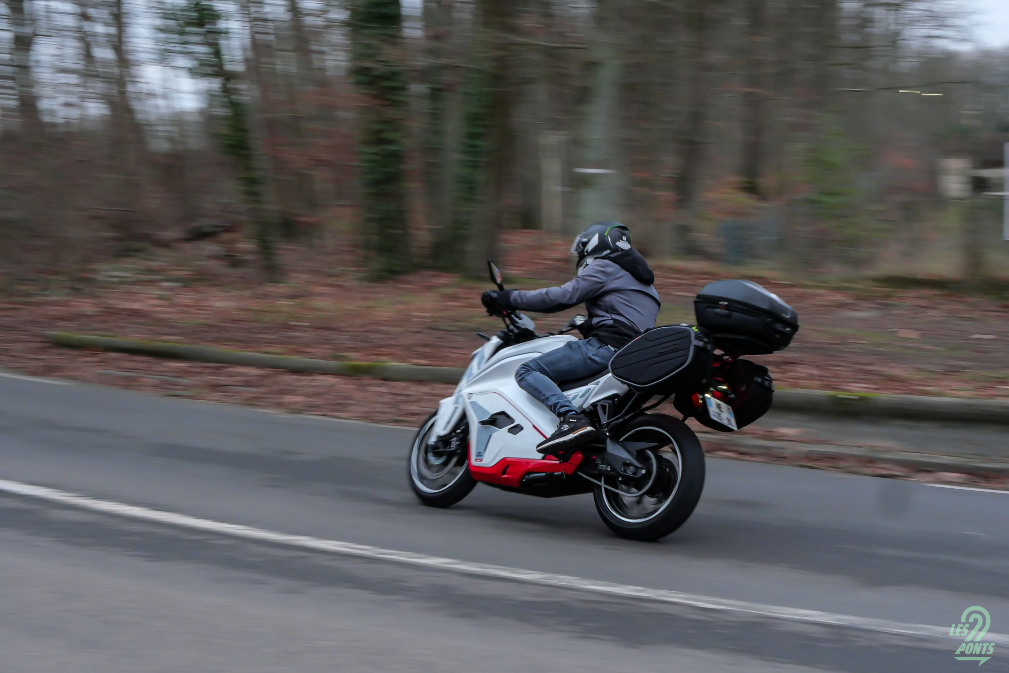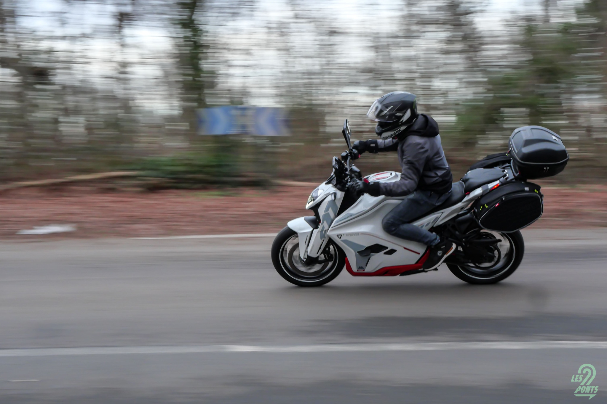 Passées 60 km/h, les reprises de la F77 sont étonnamment ‘molles’ pour une moto électrique. Il n’y a donc pas de coupure brusque lorsqu’elle arrive à sa V-Max. Il faudra, avant cela, réussir à l’atteindre. © Anthony Mota (@auto_mota)