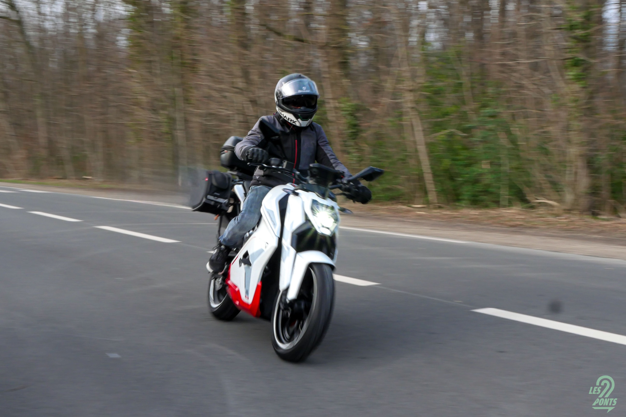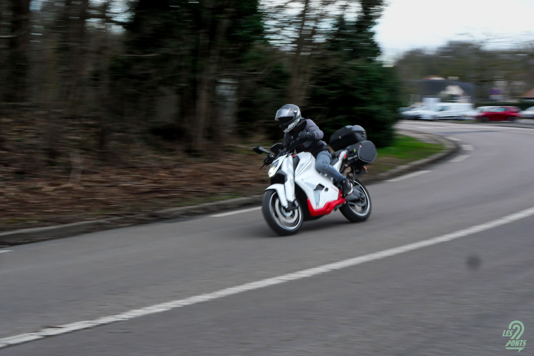 Avec son empattement de 1 340 mm, la F77 se place d’autant plus facilement dans les courbes. Elle se penche bien et son traction control n’est guère invasif. C’est rare sur les motos électriques, qui ont tendance à couper l’accélération au passage du moindre dos d’âne, voire sur les aspérités de la route. Il n’y a rien de plus désagréable lorsqu’on est lancé que d’avoir un à-coup non-justifié. La F77 fait pourtant ressentir les défauts de la chaussée, ce qui doit pouvoir se limiter en modifiant le réglage de l’amortisseur avant. Les suspensions manquent encore de souplesse pour un usage quotidien.